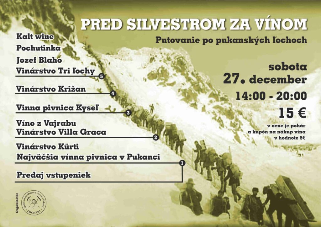 Ľochári v Pukanci organizujú v sobotu 27. decembra 2025 po úspešnom minuloročnom podujatí vínnu cestu „Pred Silvestrom za vínom“. Na piatich zastávkach budete môcť navštíviť niekoľko otvorných vínnych pivníc – ľochov a ochutnať vínka od 9 miestnych vinárov. Pukanské ľochy vysekané v sopečnom podloží sú zaujímavým dedičstvom pukanských vinárov. Len výnimočne sa dá nazrieť do viacerých naraz a preto si nenechajte ujsť túto príležitosť.